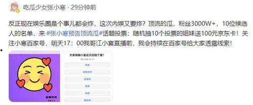 最近娱乐圈可是热闹非凡呢!张小寒这位知名博主又来了一波大爆料,这次的顶流瓜可是让人眼睛一亮,嘴巴都合不拢。咱们就一起来聊聊这个话题,看看张小寒这次都爆了哪些猛料吧!
